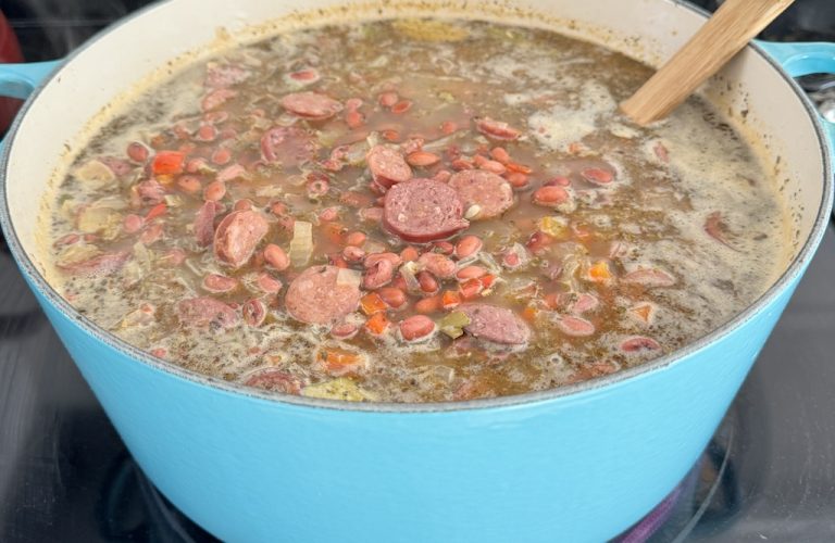 Drain water off the soaked red beans and add the beans to the pot. Cover with fresh water. Rub the basil between the palms of your hands as you add it to the pot. Add sage and bay leaves. Add sausage back to the pot and stir well.