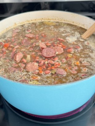 Ingredients 1 pound Camellia red beans, soaked 1 pounds good smoked sausage, preferably andouille, sliced into coins 3 tablespoons oil 2 medium onions, chopped 1 rib celery, chopped 1 bell pepper, chopped 6 to 8 …